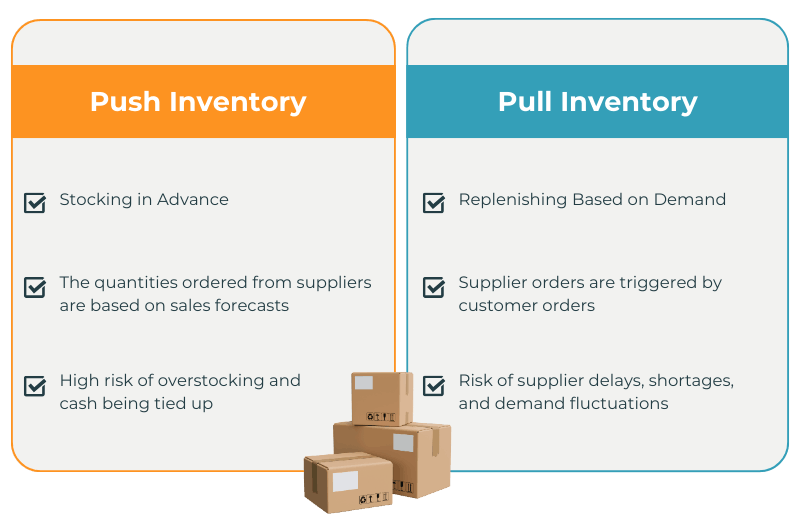 A push system is an inventory approach in which products are purchased or manufactured based on sales forecasts and held in inventory until they are sold. While this model can provide a sense of security and high service levels, it exposes SMBs to overstocking risks and significant cash immobilization.